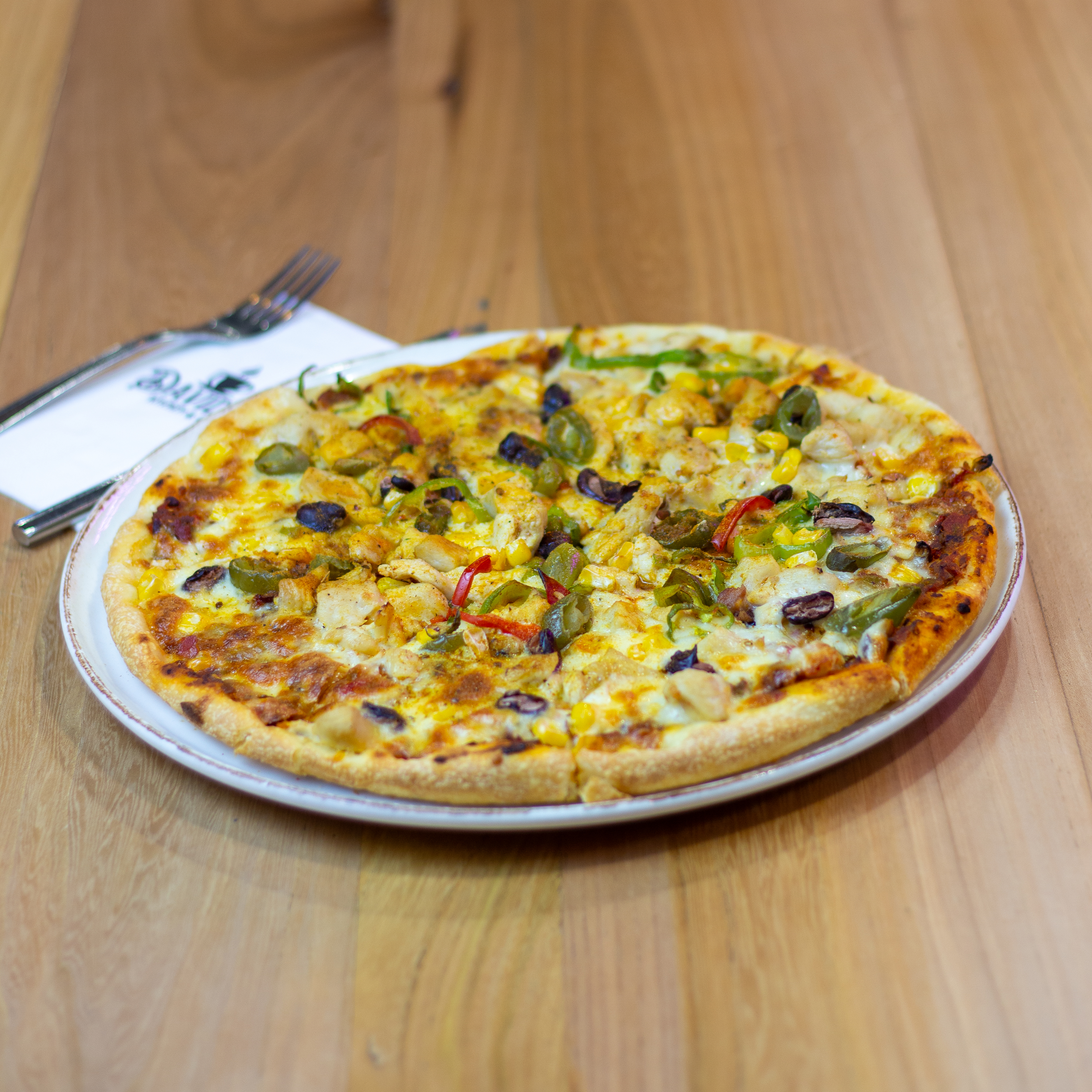 Pizza sosu,mısır, mantar, renkli biber, cheddar, füme eti, zeytin