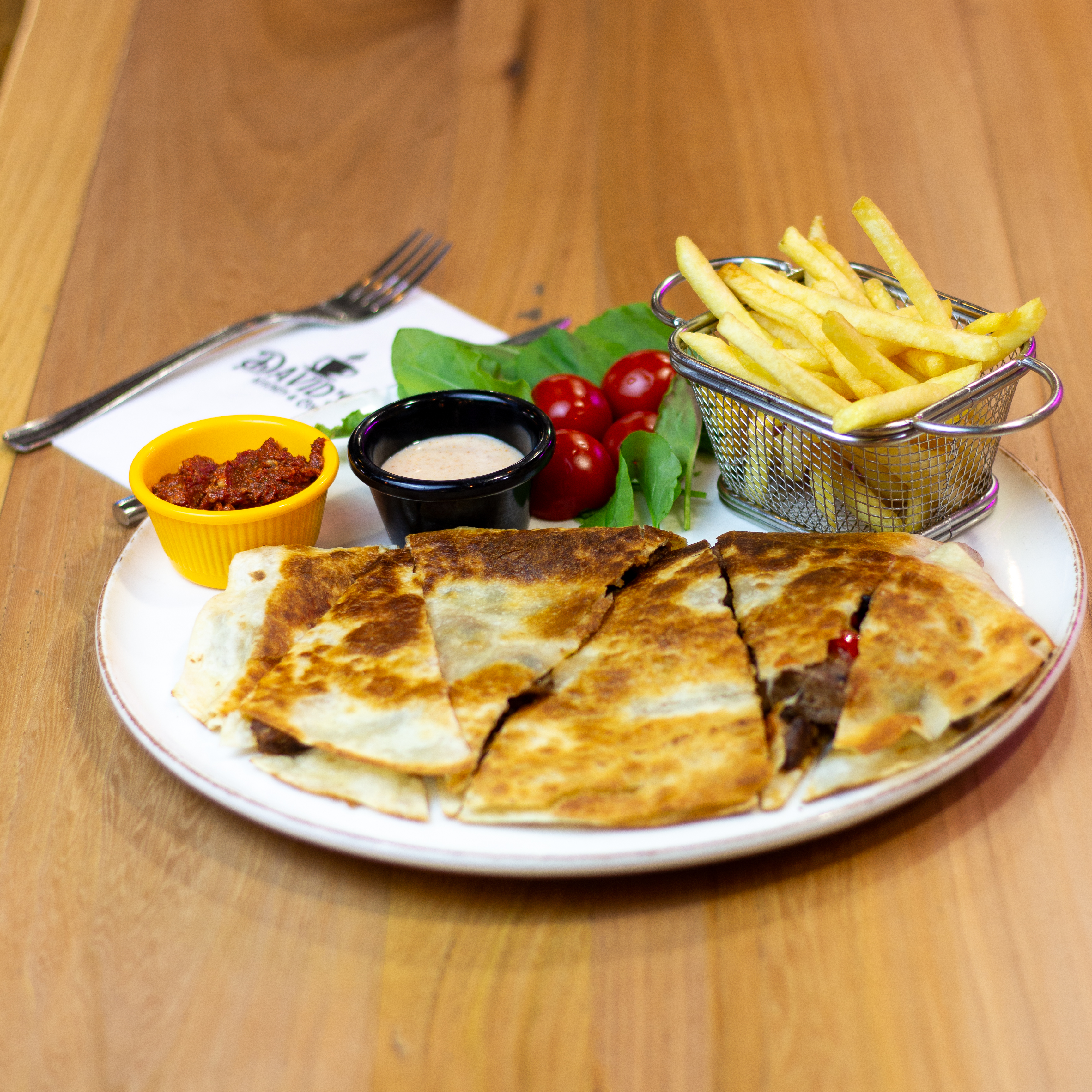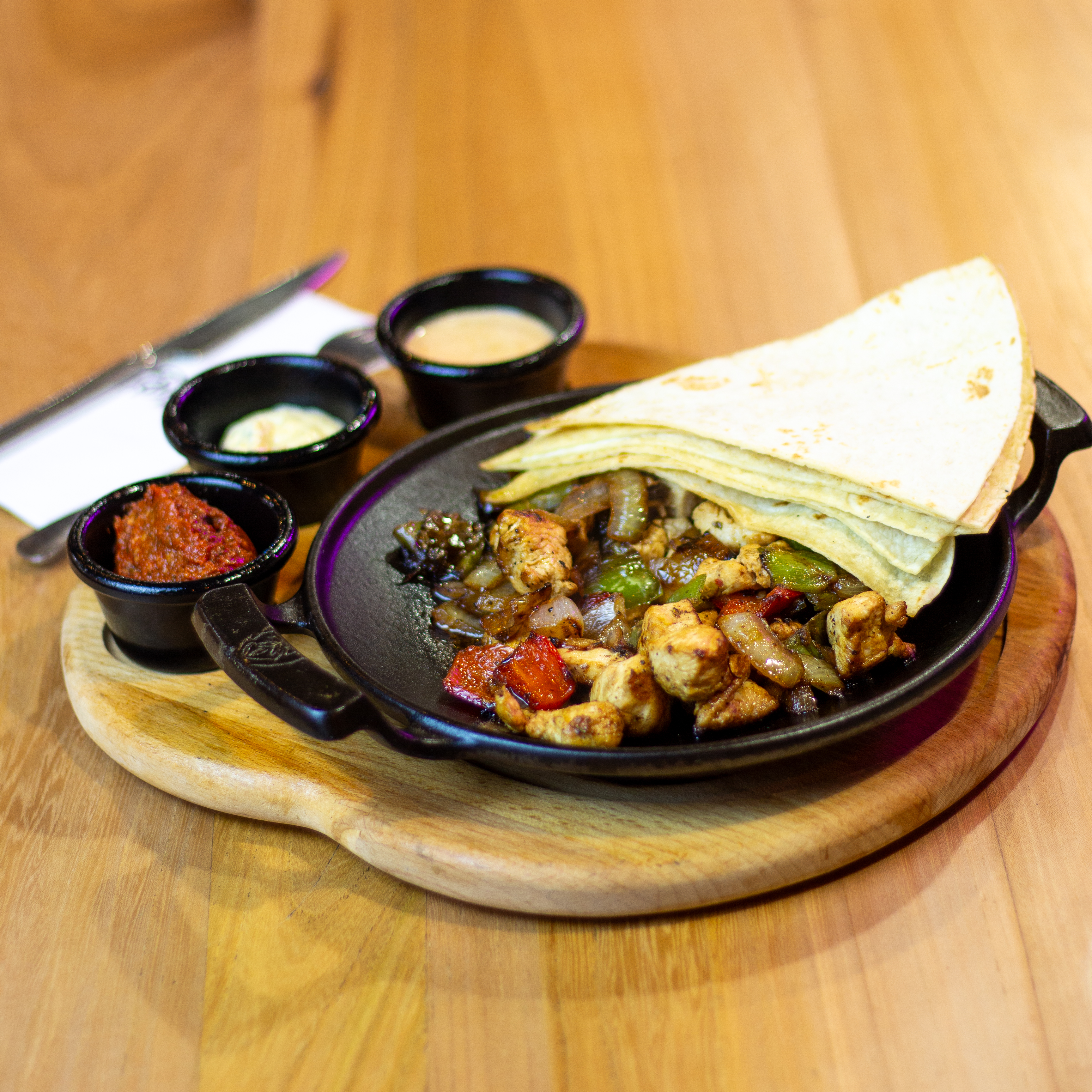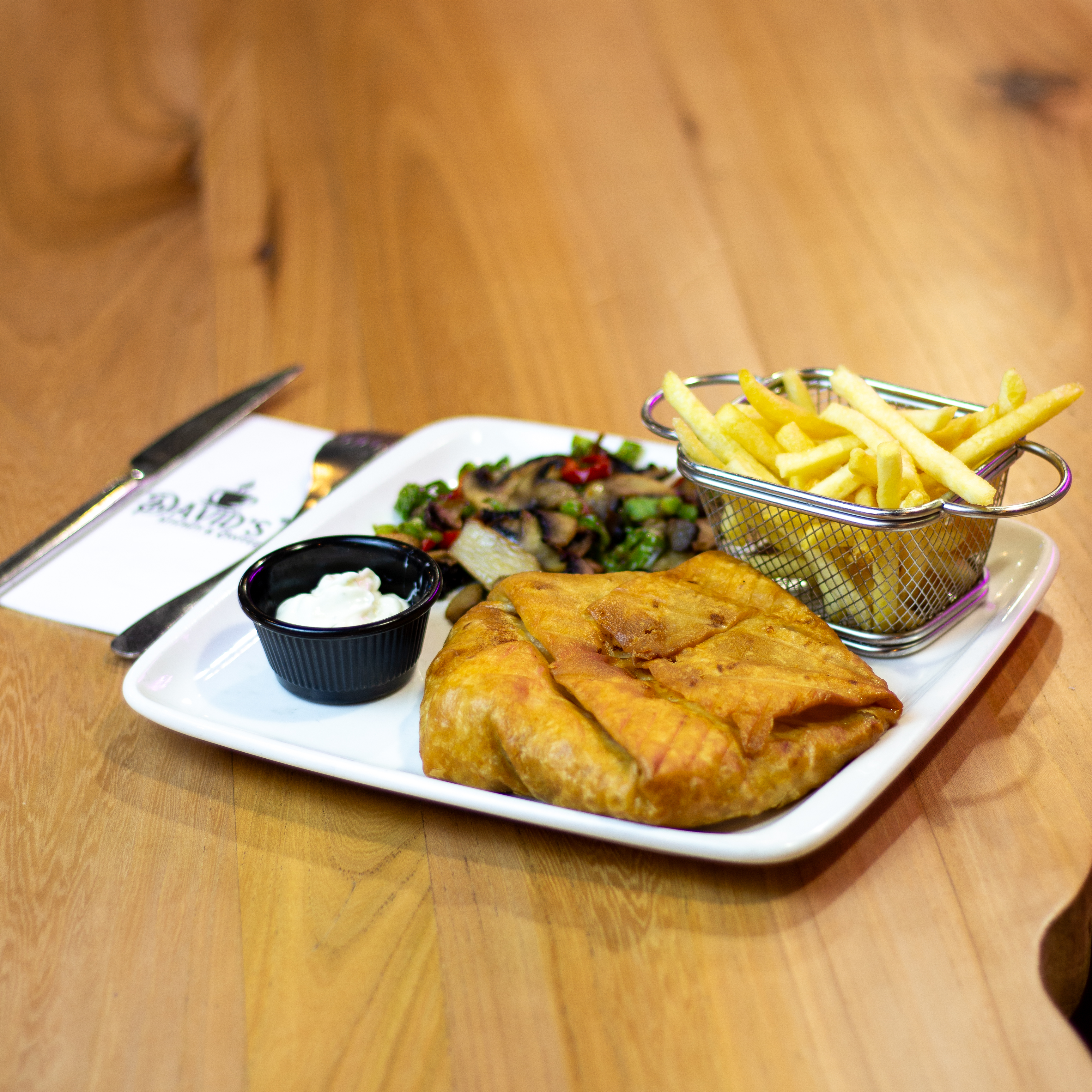 200 gr tavuk gögsü, renkli biber, cheddar peyniri yaninda patates kizartmasi, mevsim salatasi ve soslar ile.
