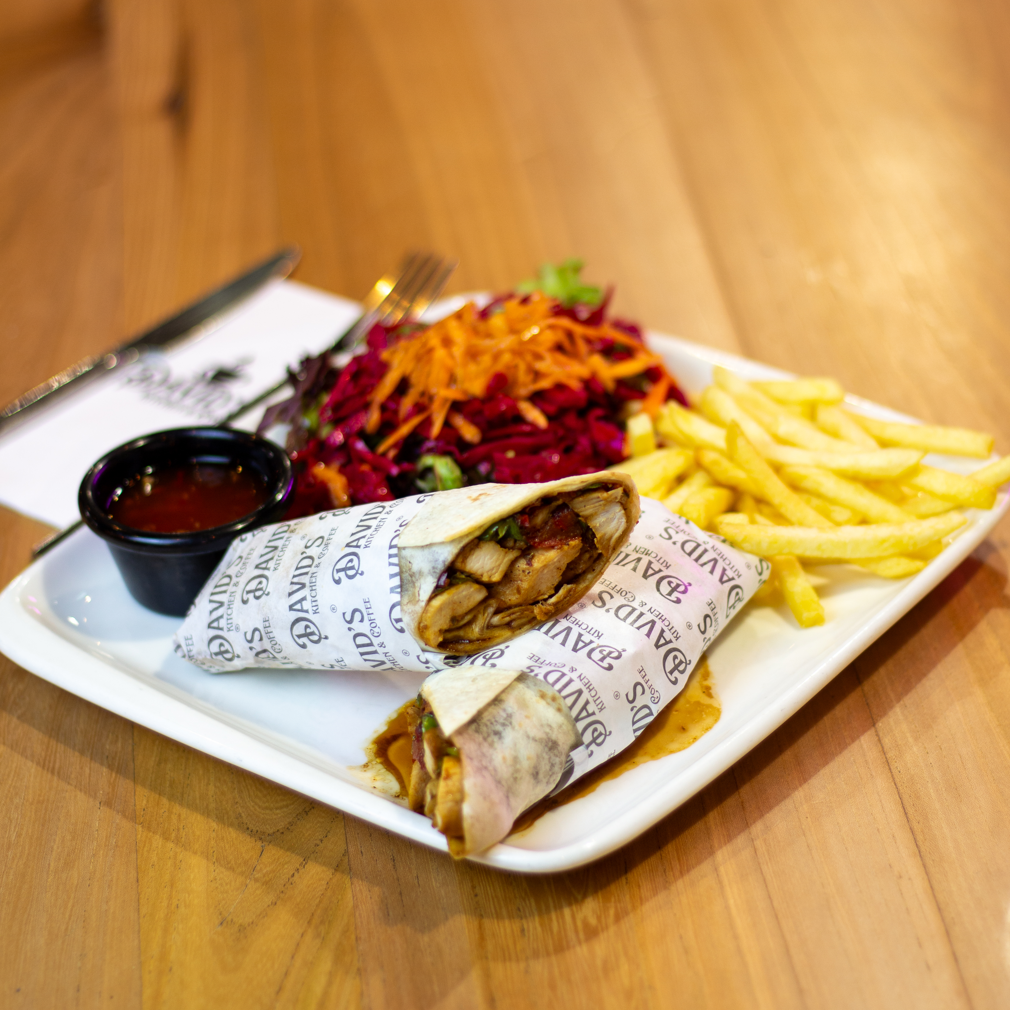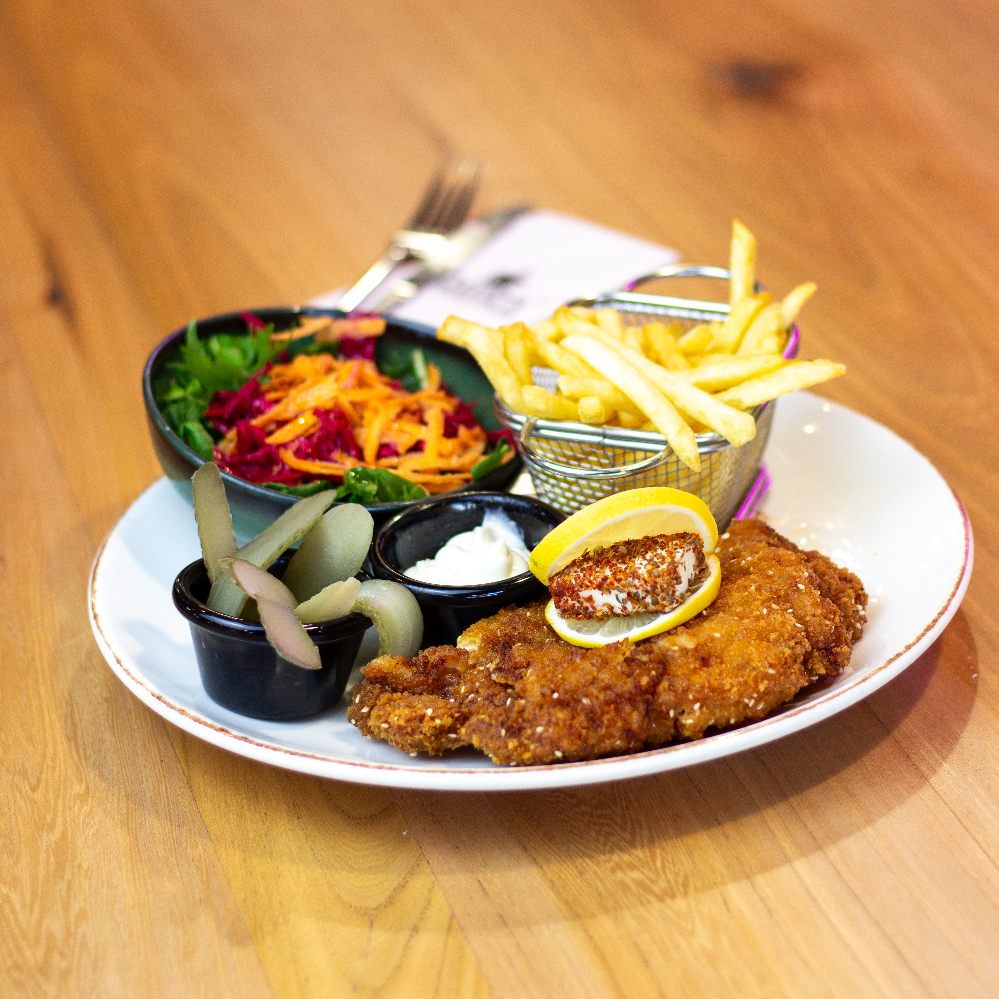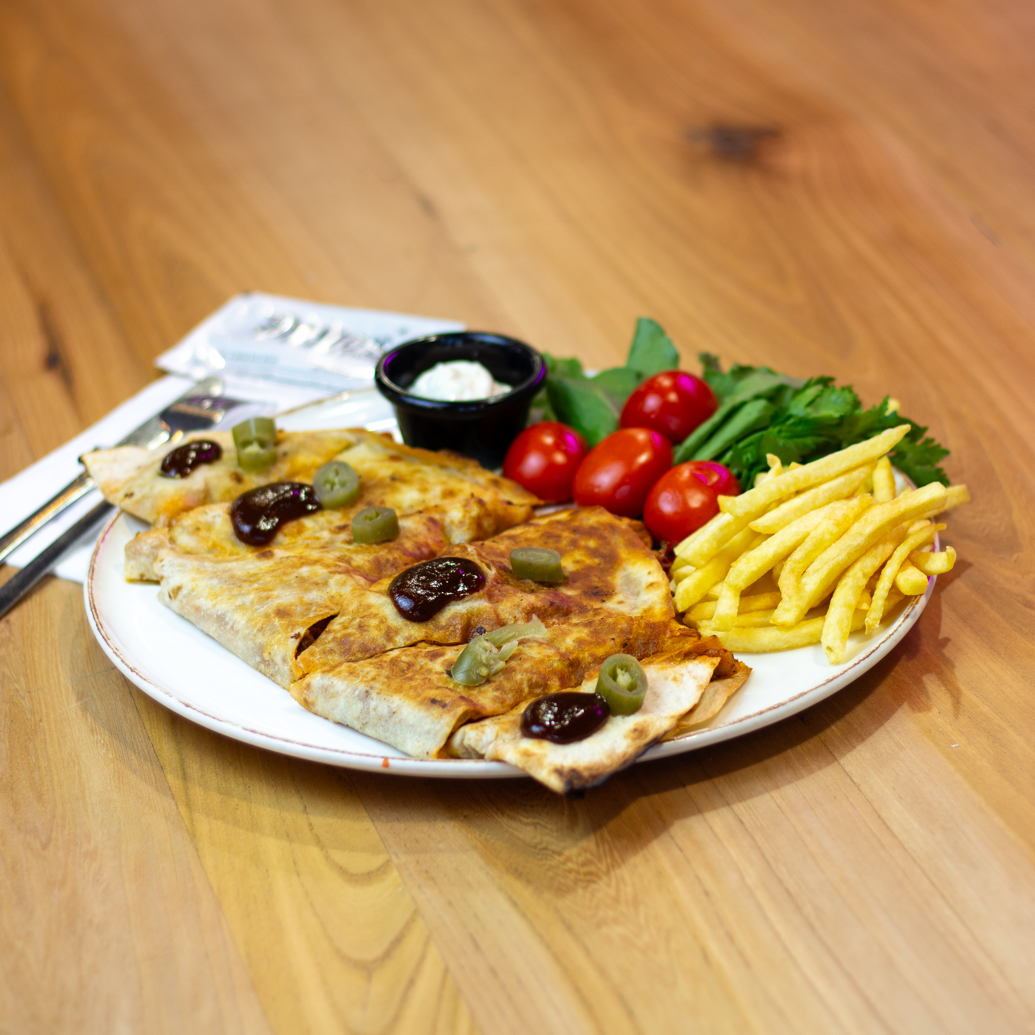 200 gr tavuk gögsü, renkli biber, cheddar peyniri yaninda patates kizartmasi, mevsim salatasi ve soslar ile.