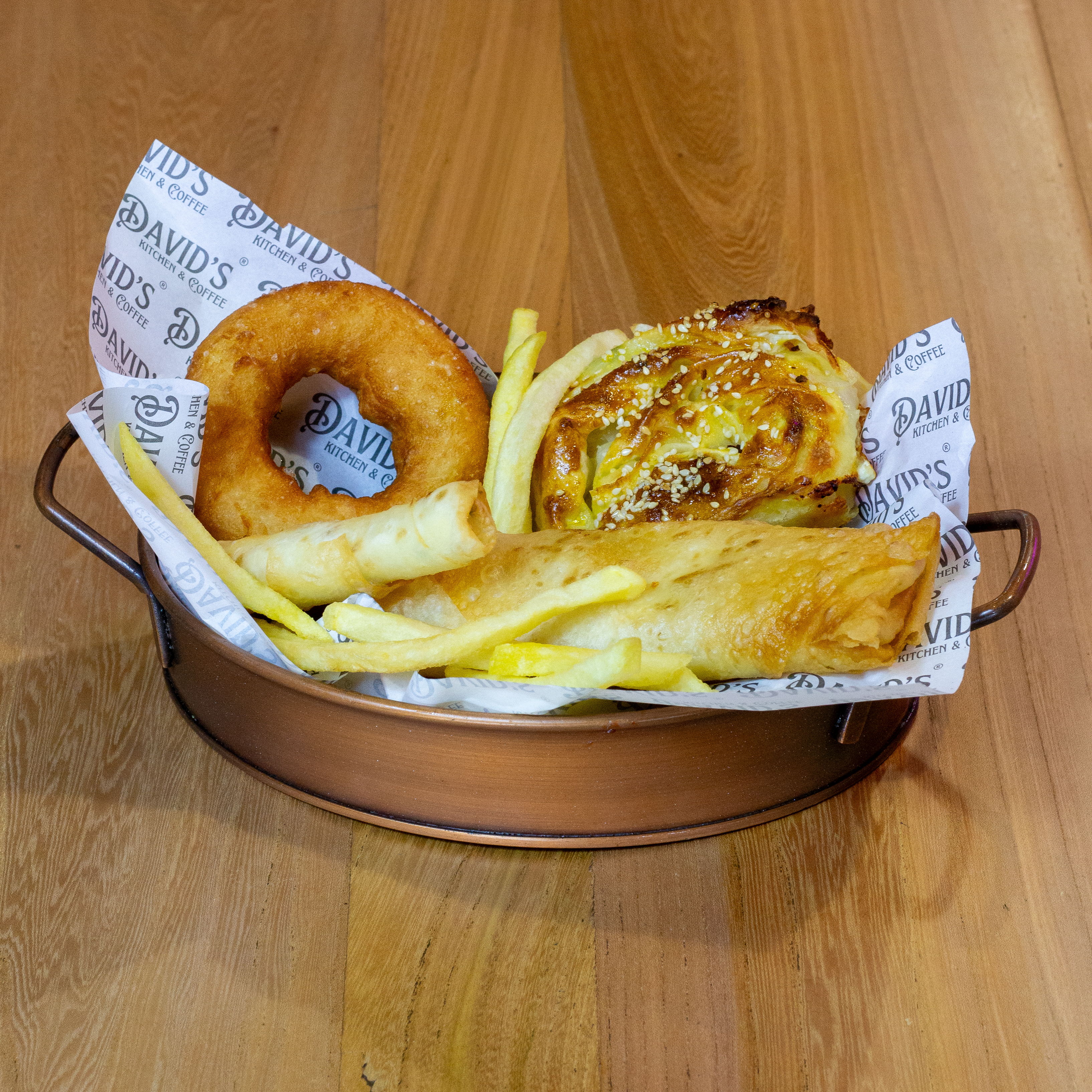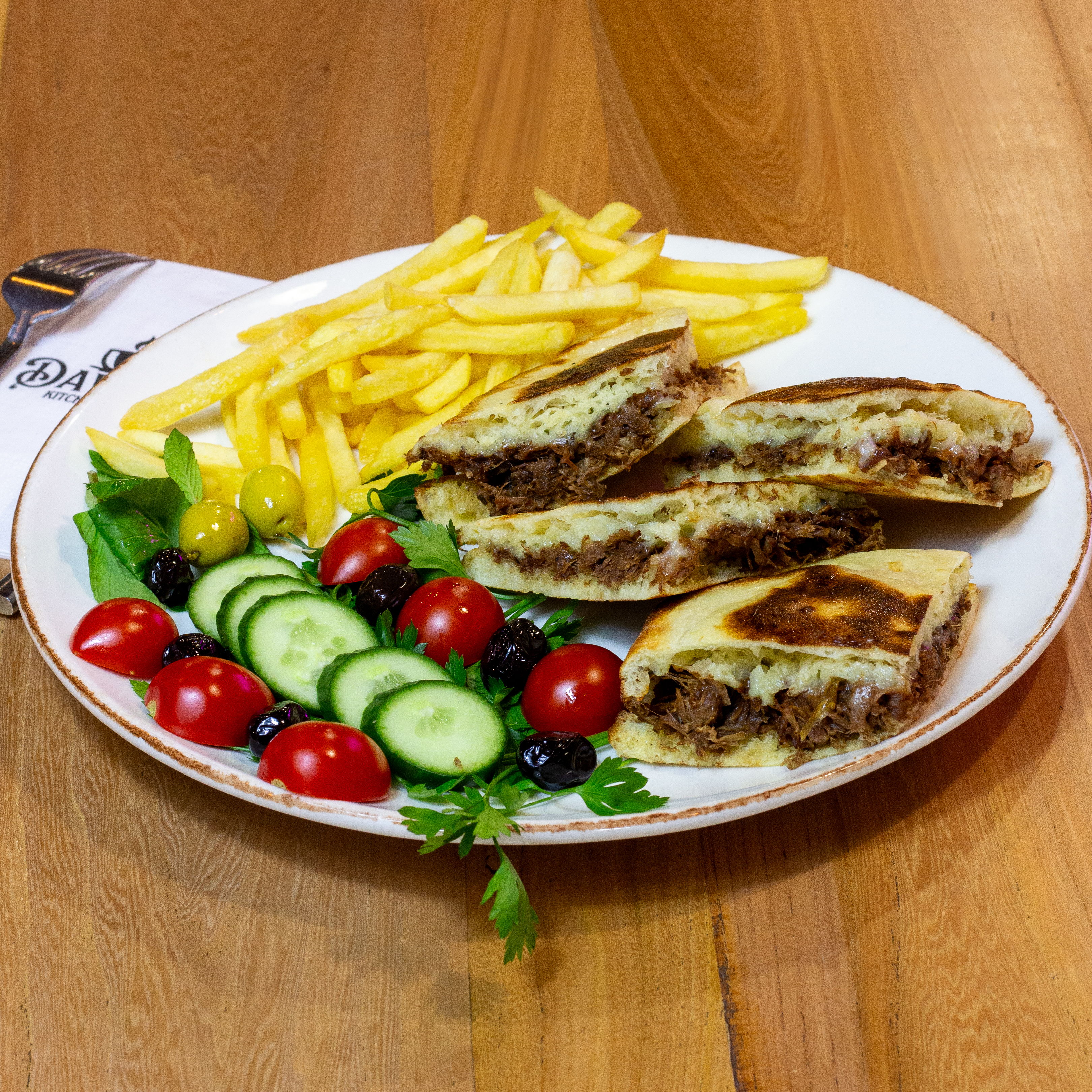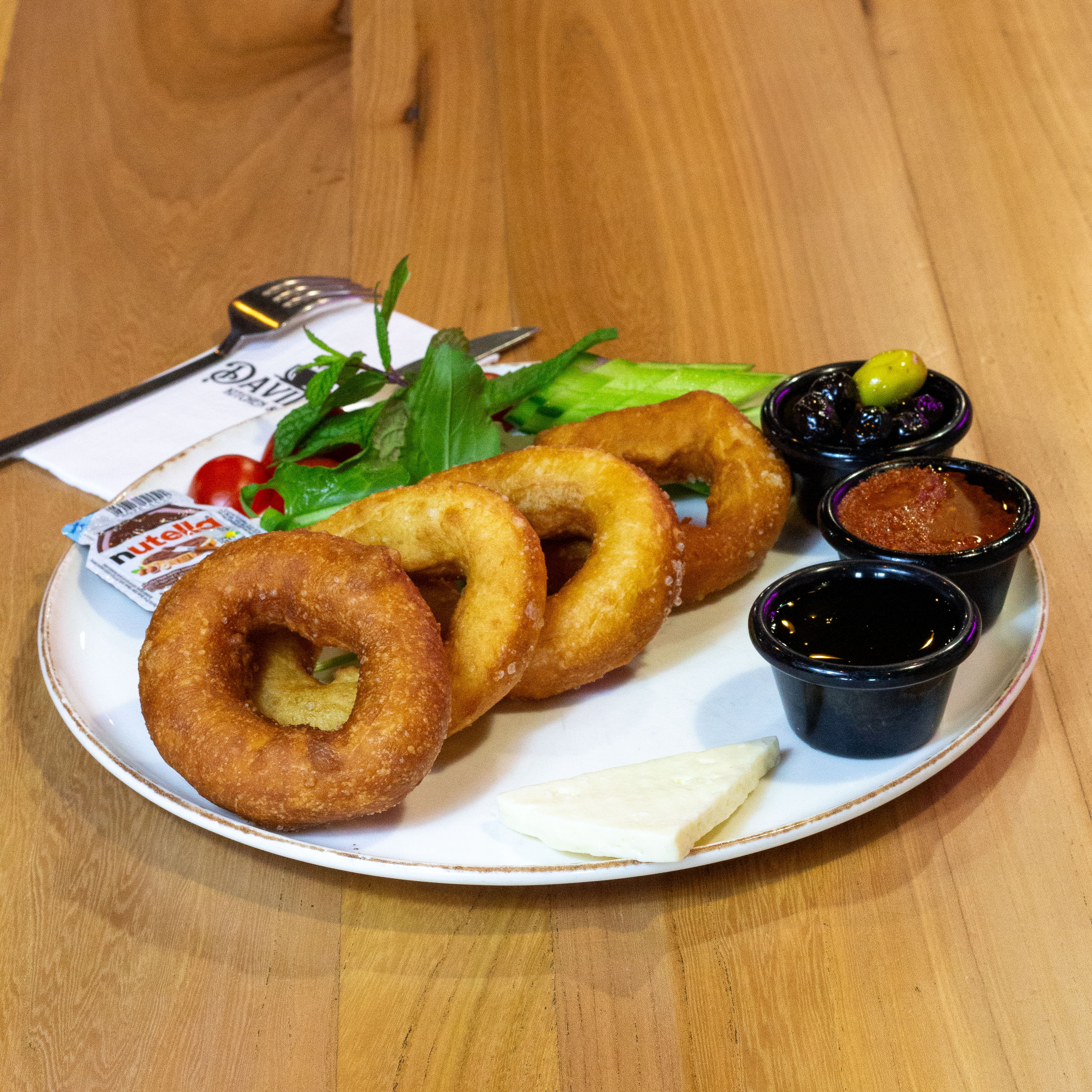 4 adet Pişi, Patates Kızartması yanında Domates, Salatalık, Zeytin ve Yeşillikler ile servis edilir.