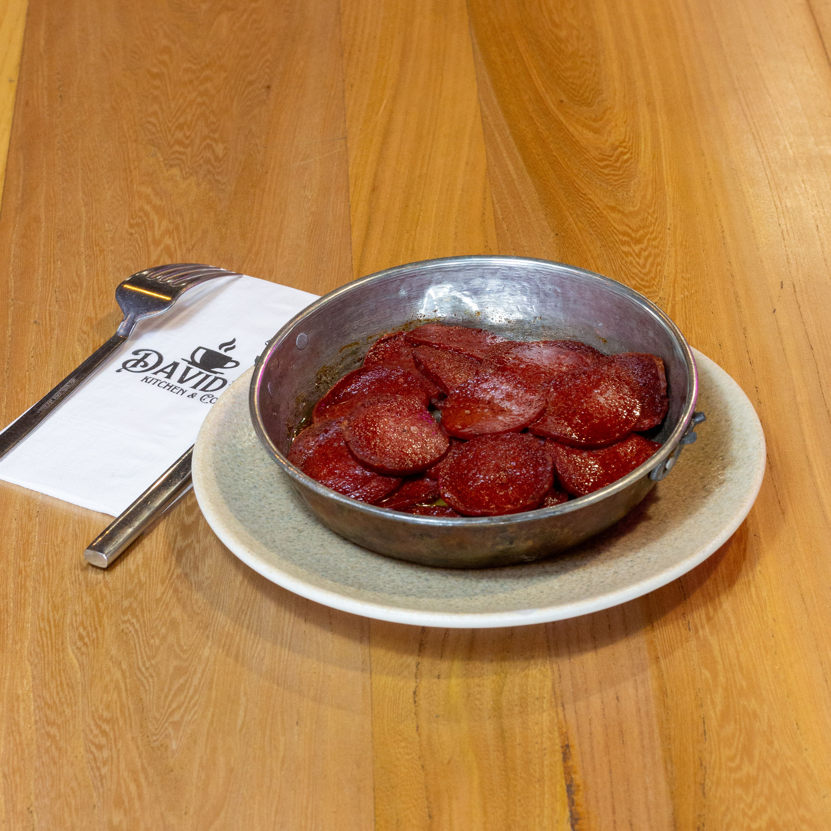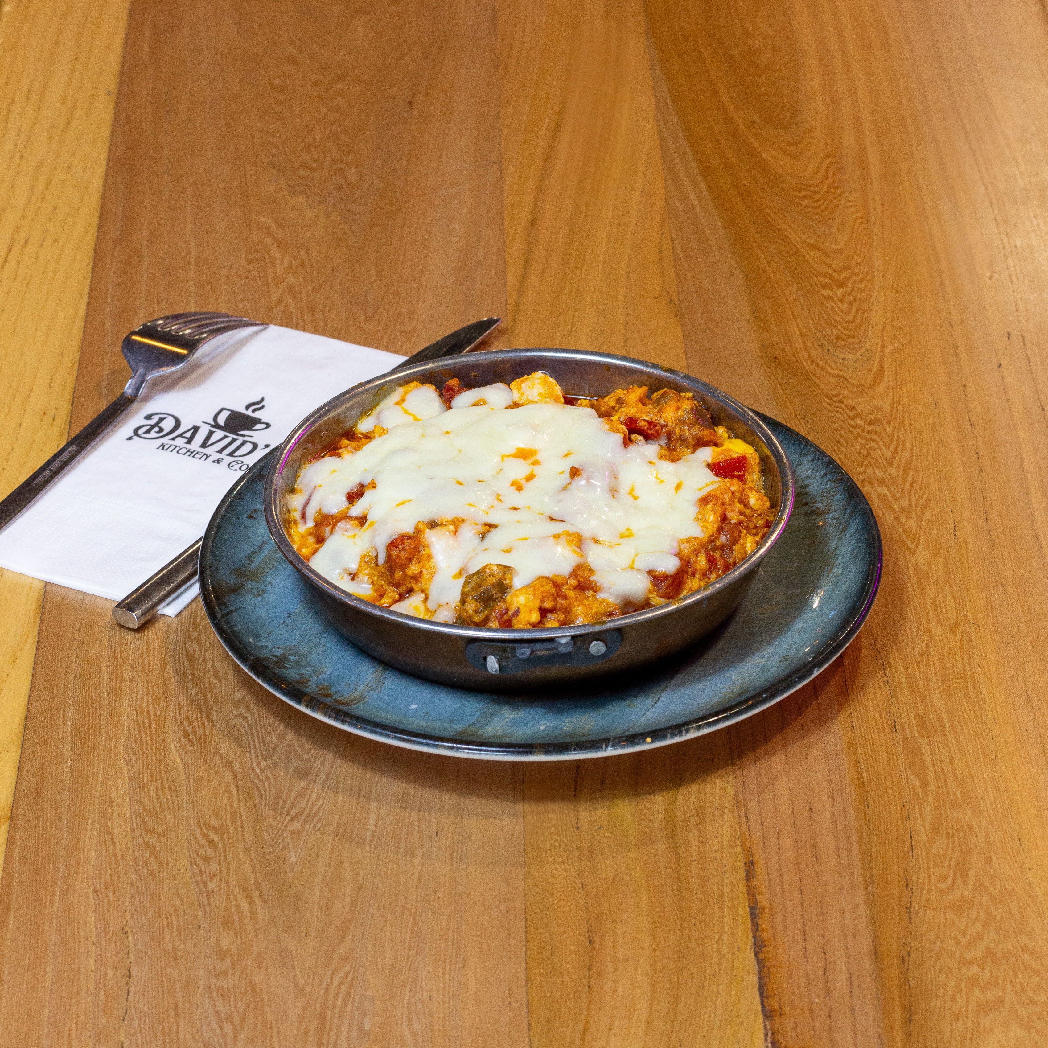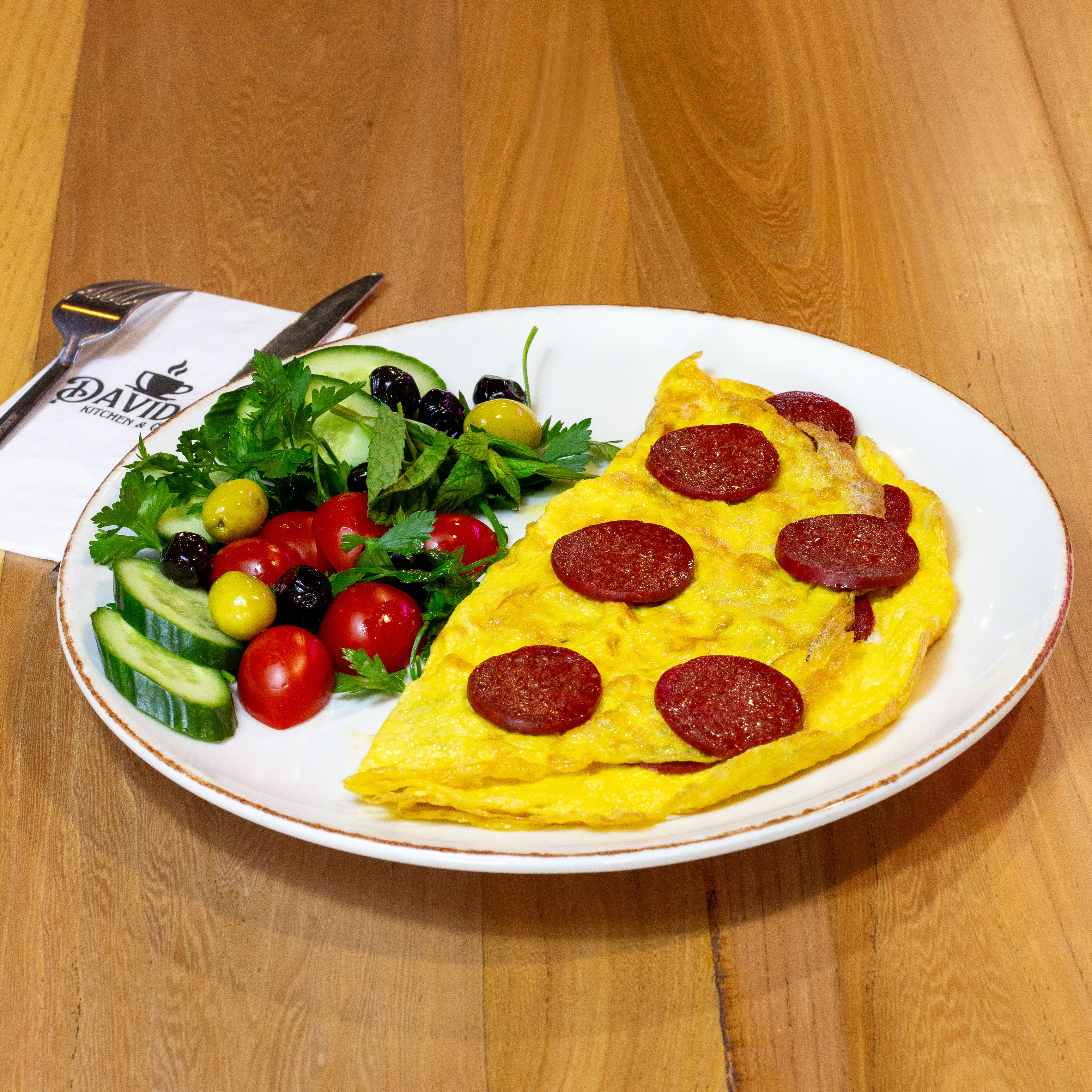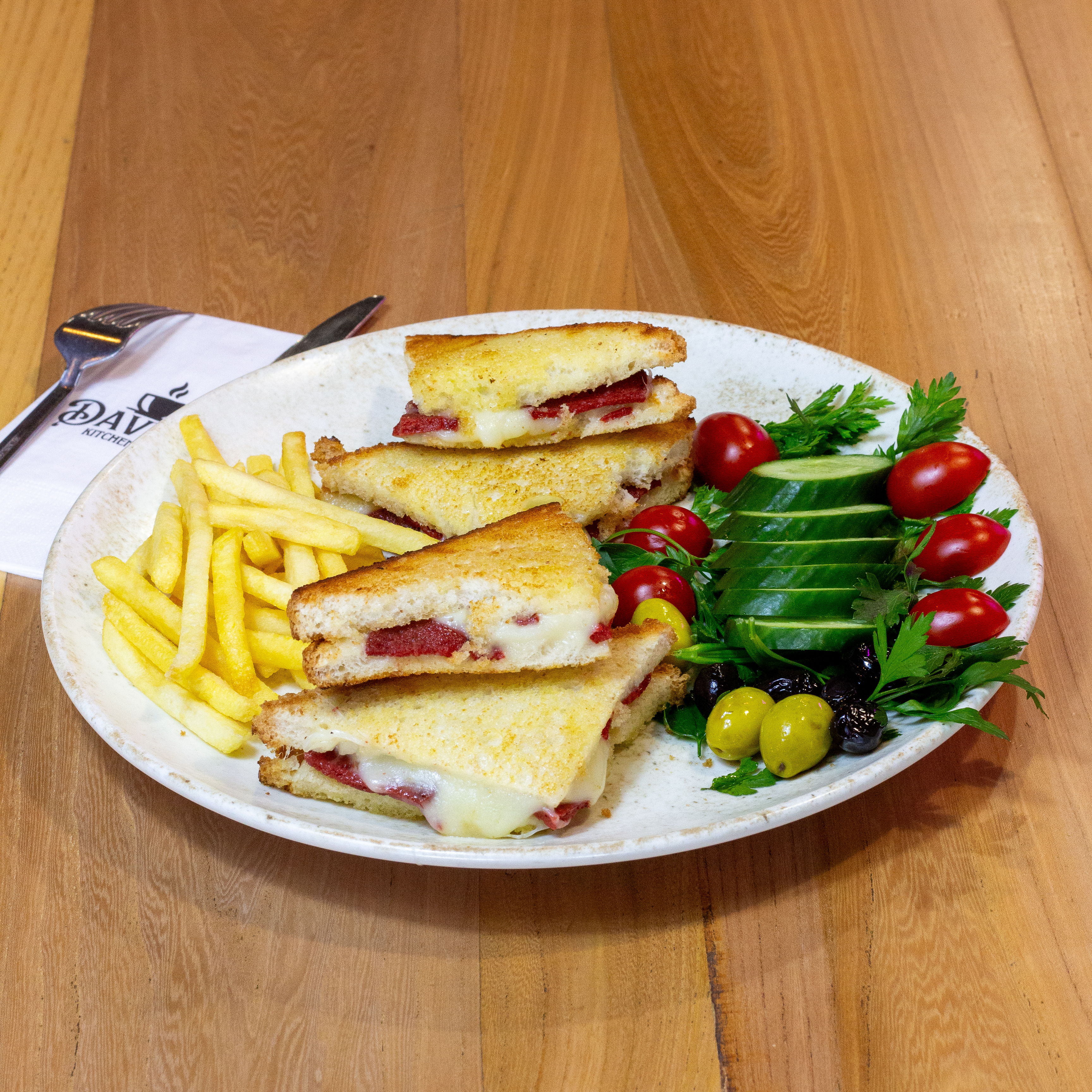 Kaşar, Sucuk Domates, Salatalık,Patates ile servis edilir.