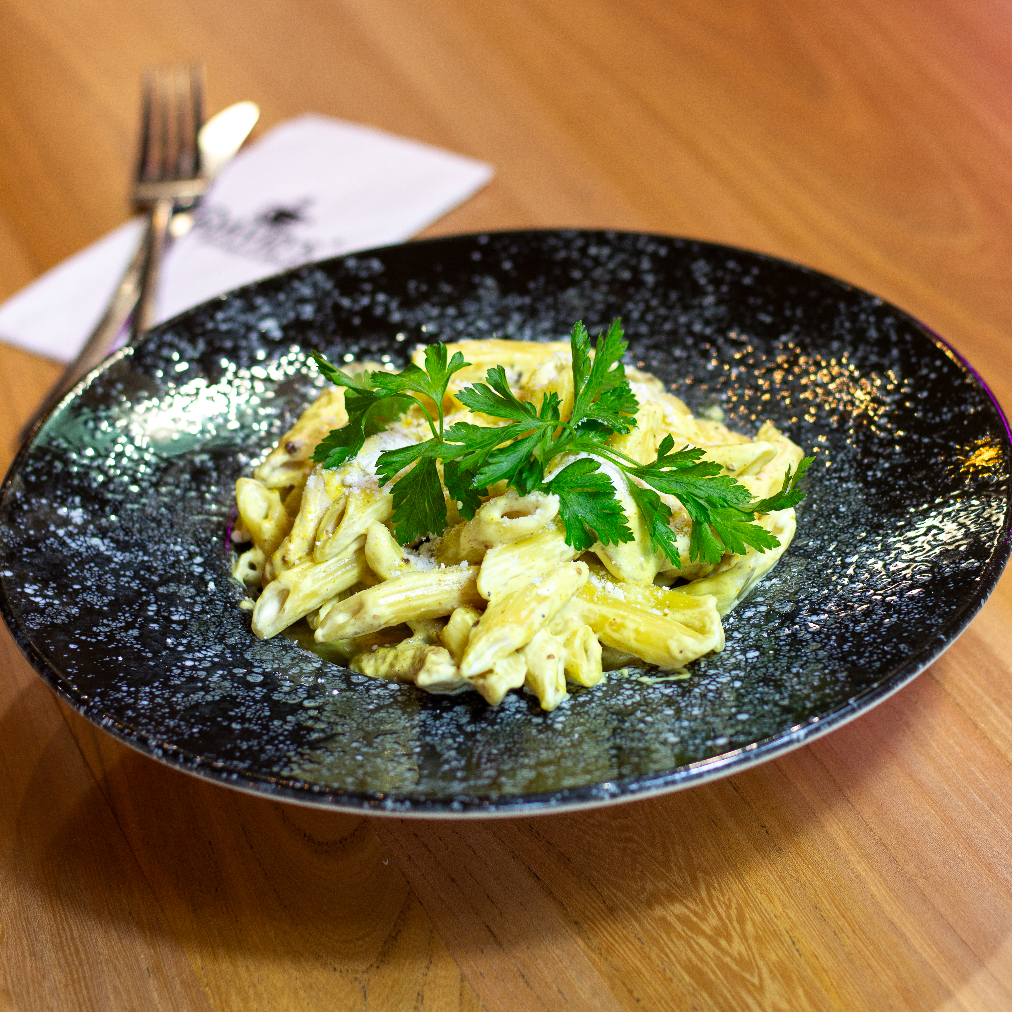 Penne Makarna, Tavuk, mantar, çeri domates, toz permesan,maydanoz