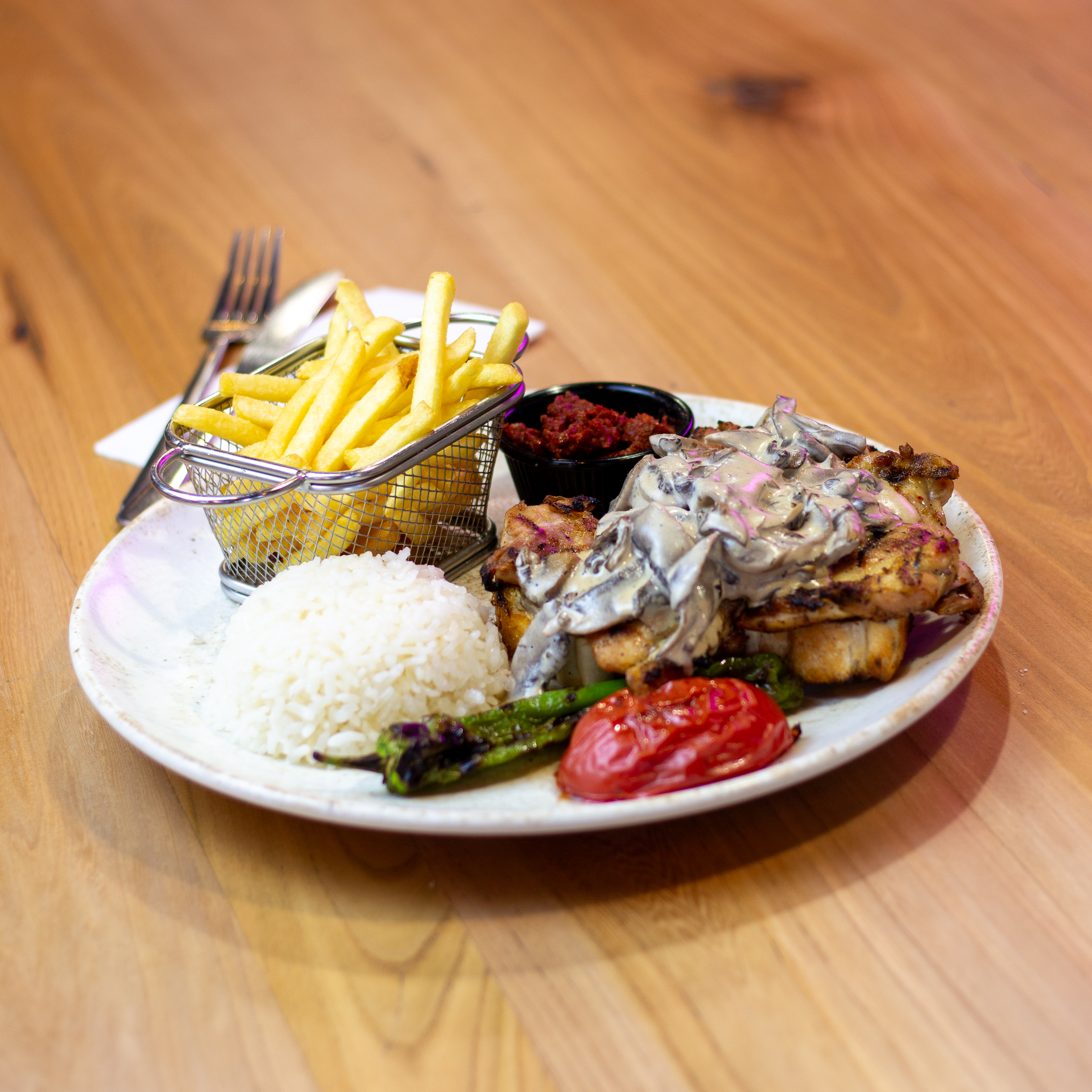 200 gr ızgara tavuk, sosu içerisinde krema, soğan, mantar, yanında pilav