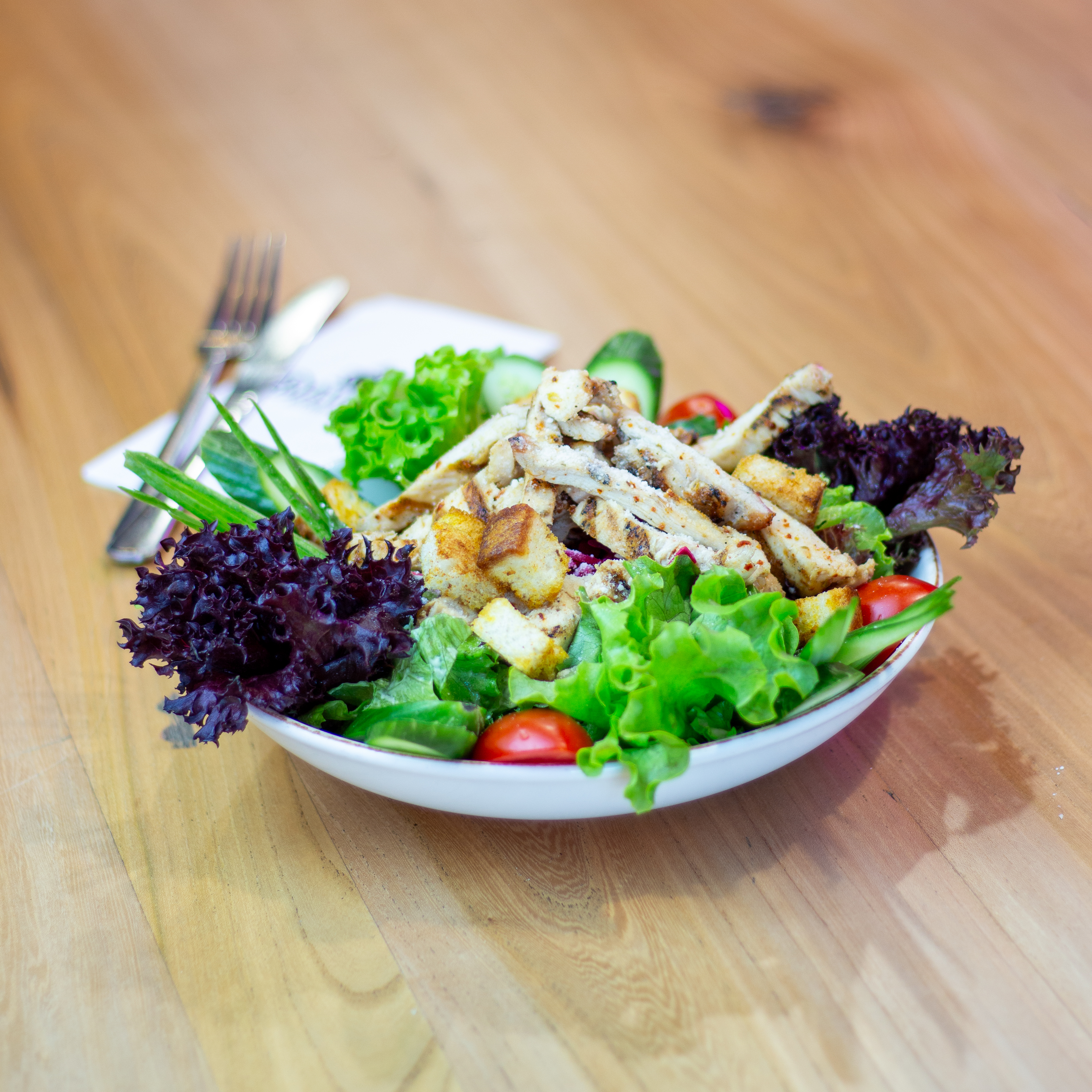 Çıtır Tavuk parçaları, mevsim yeşilliği, çeri domates, mısır ve salata sosu.