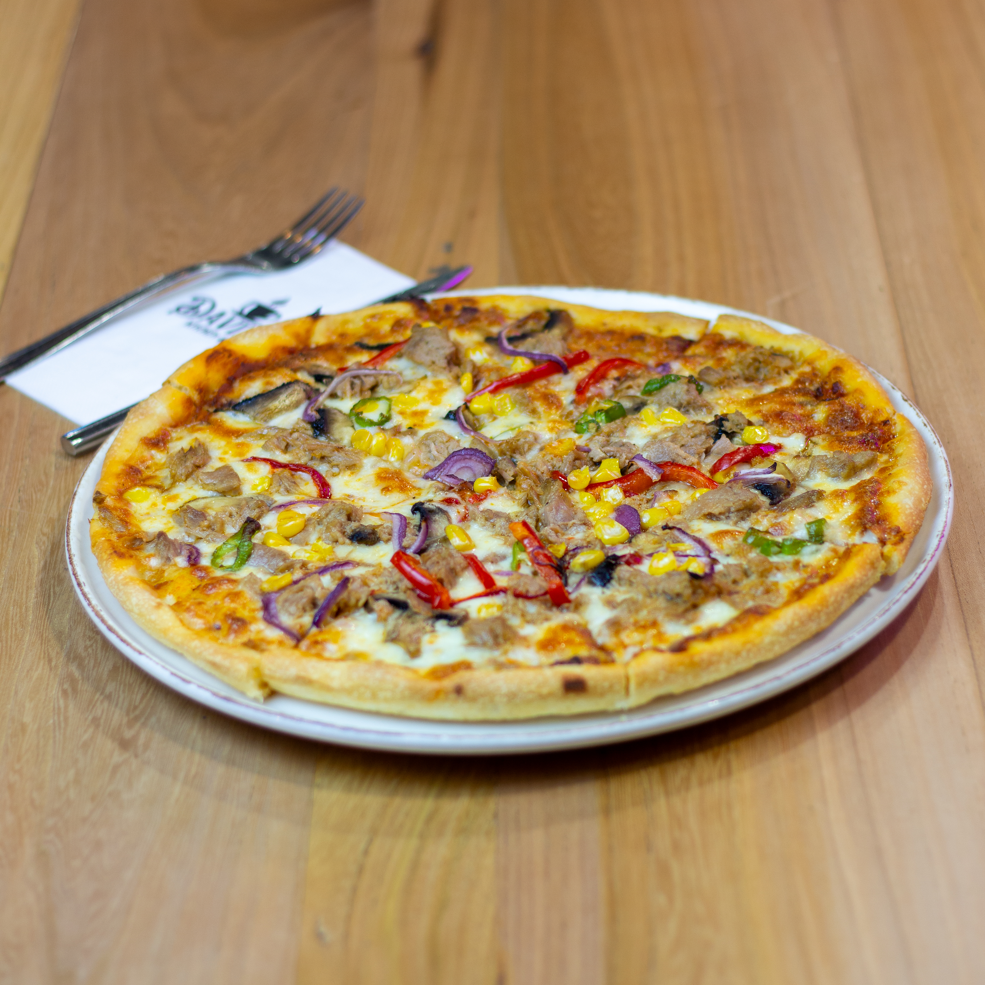 Ton balığı, kırmızı soğan, mısır, renkli biber, mantar, mozzarella, pizza sosu