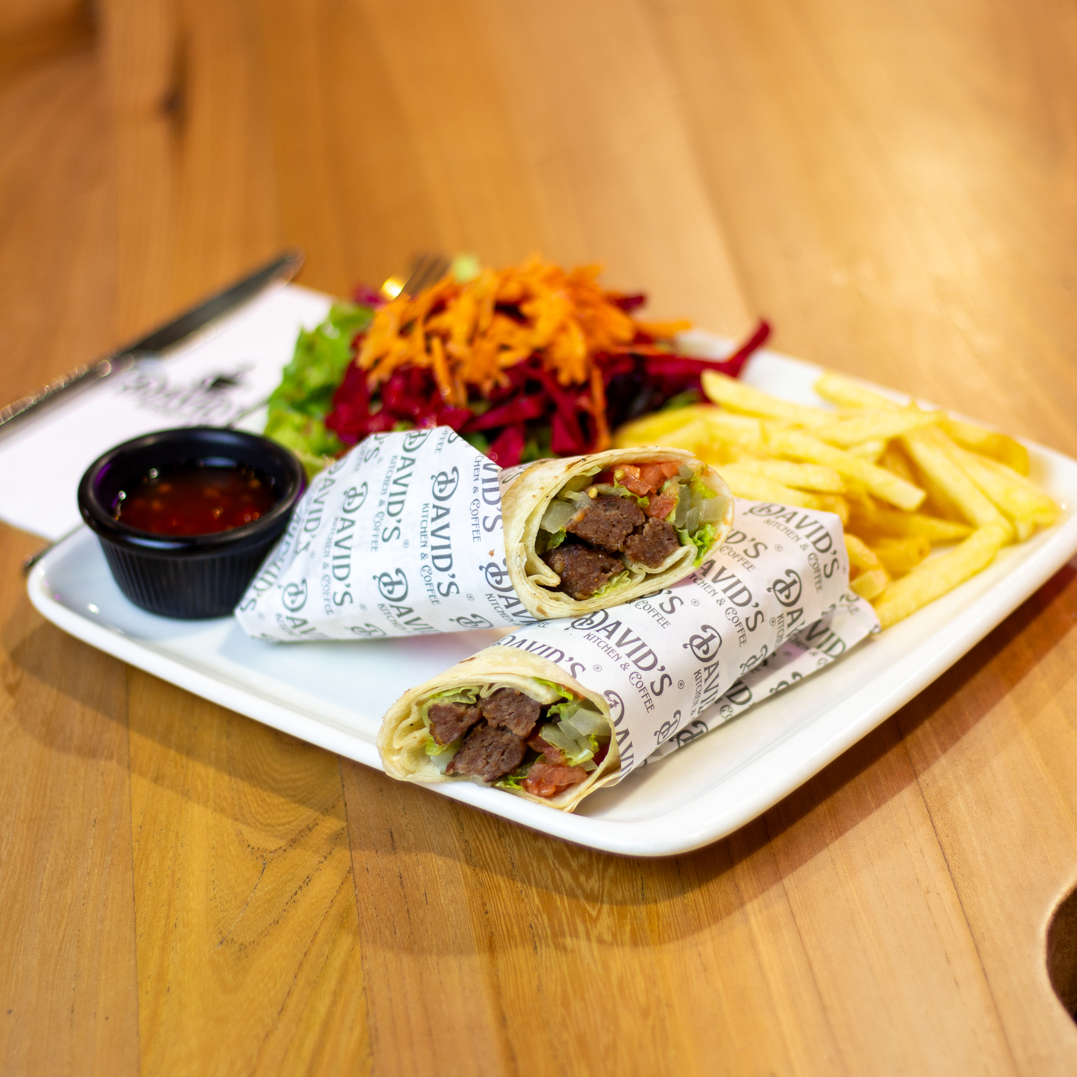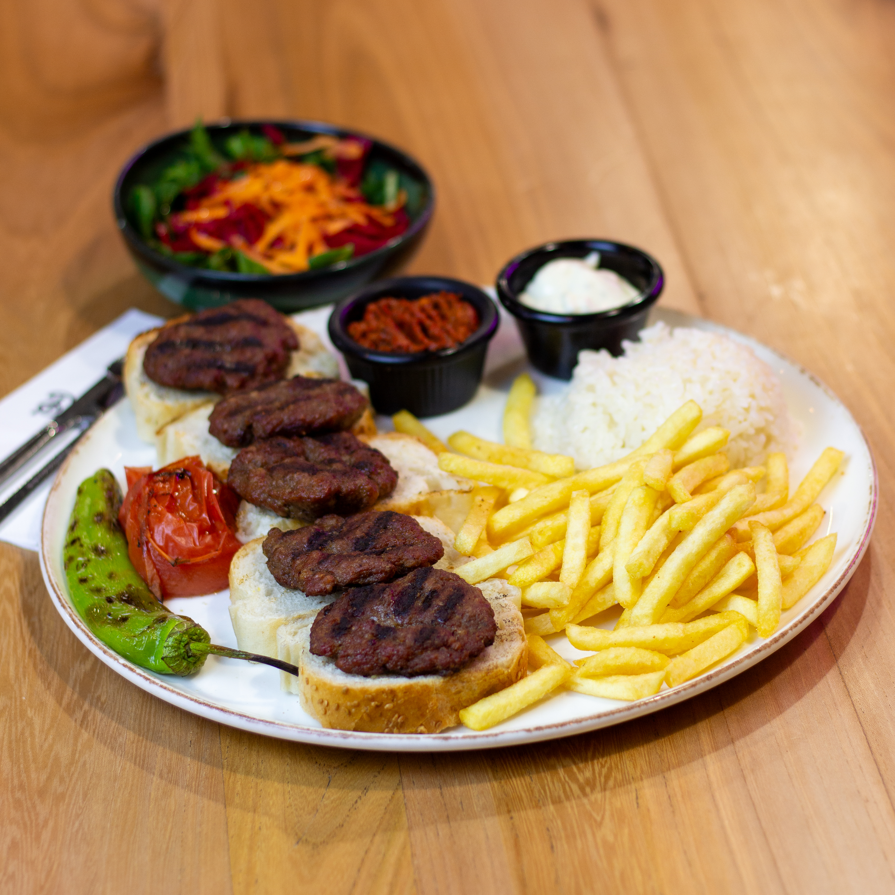 3 adet 50 gr köfte, mevsim yegilligi, kirmizi sogan, cheddar peyniri yaninda patates kizartmasi ve soslar ile.