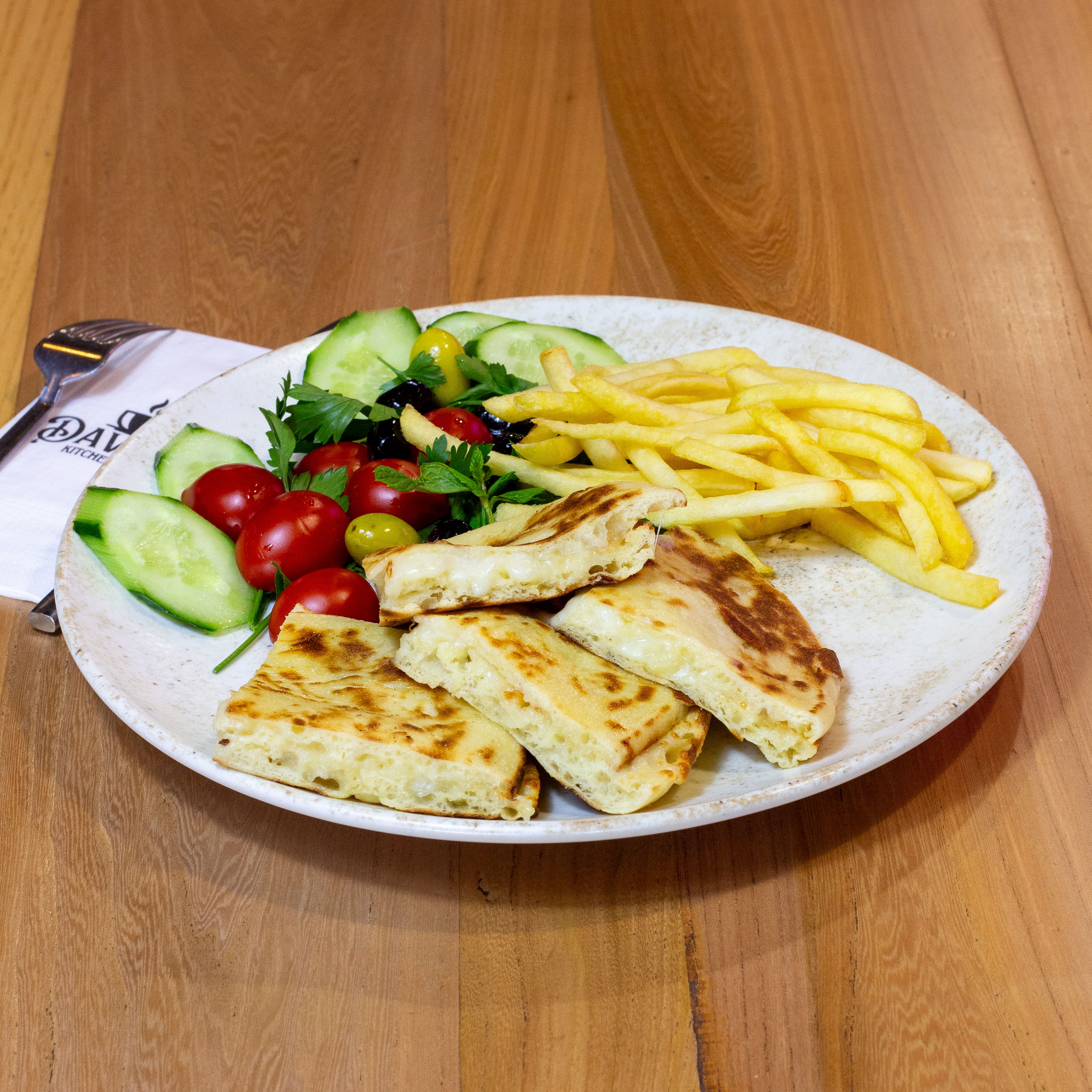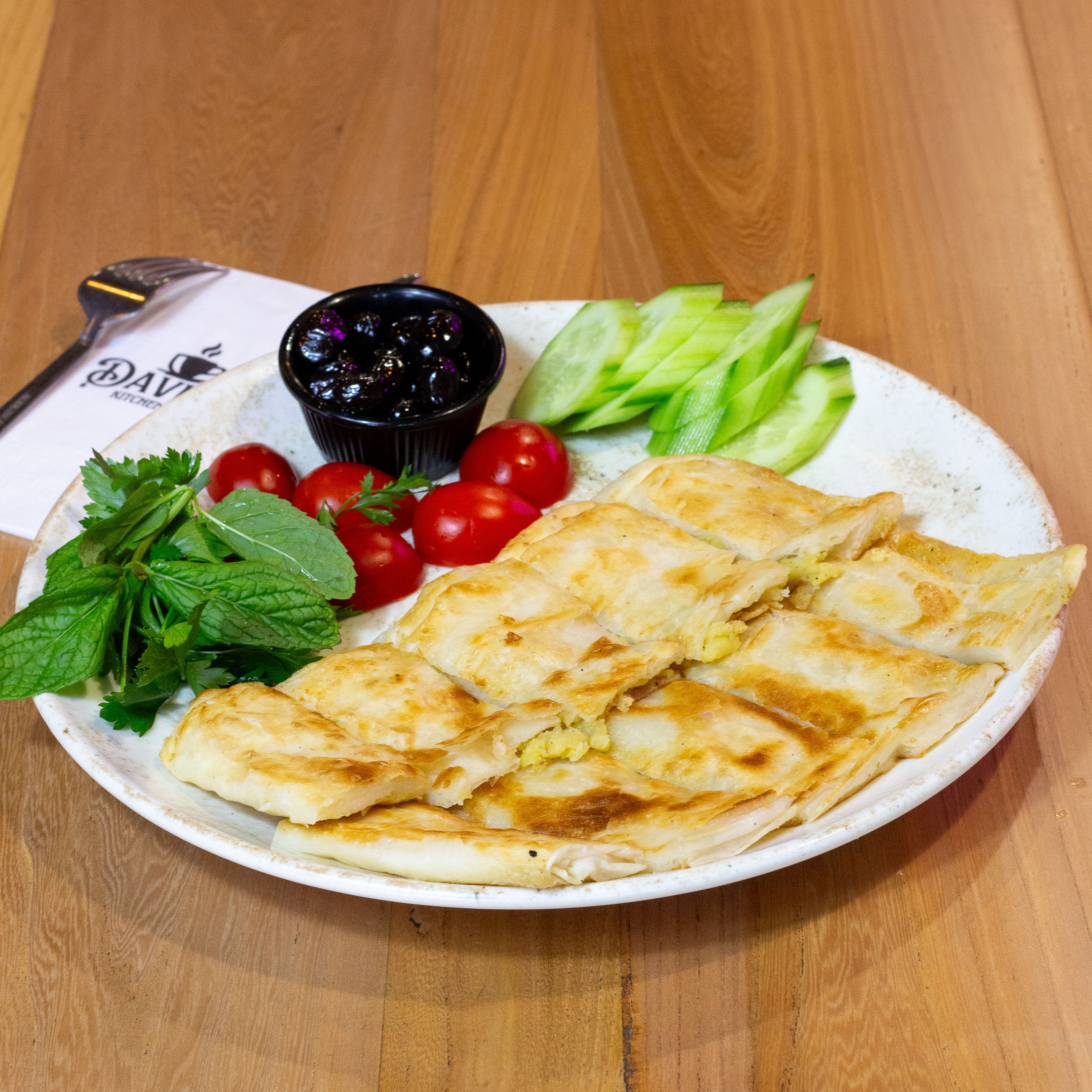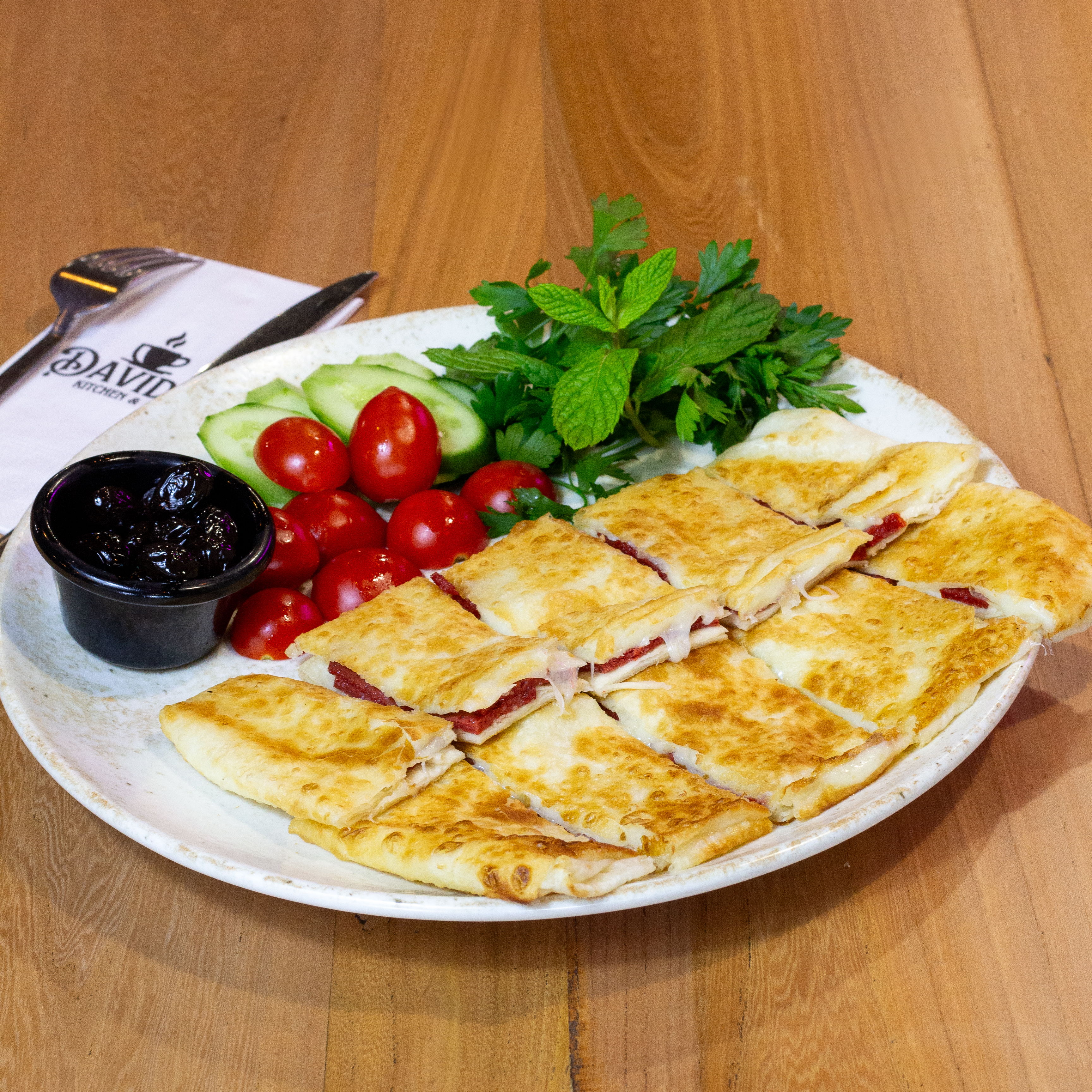 Sucuk ve Kaşarlı Gözleme,Domates, salatalık ve zeytin ile servis edilir