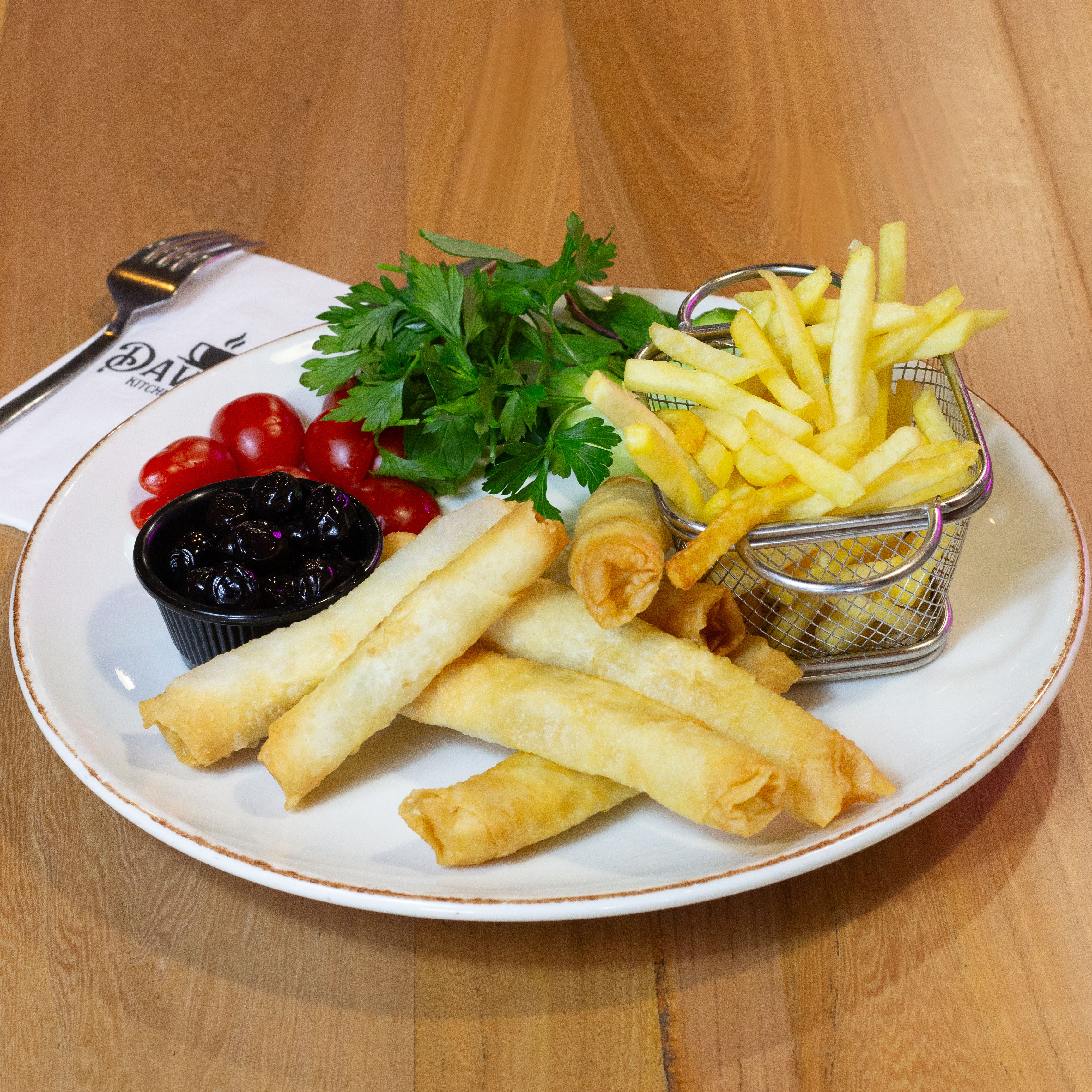 Sigara Böreği, Patates Kızartması yanında Domates, Salatalık, Zeytin ve Yeşillikler ile servis edilir.