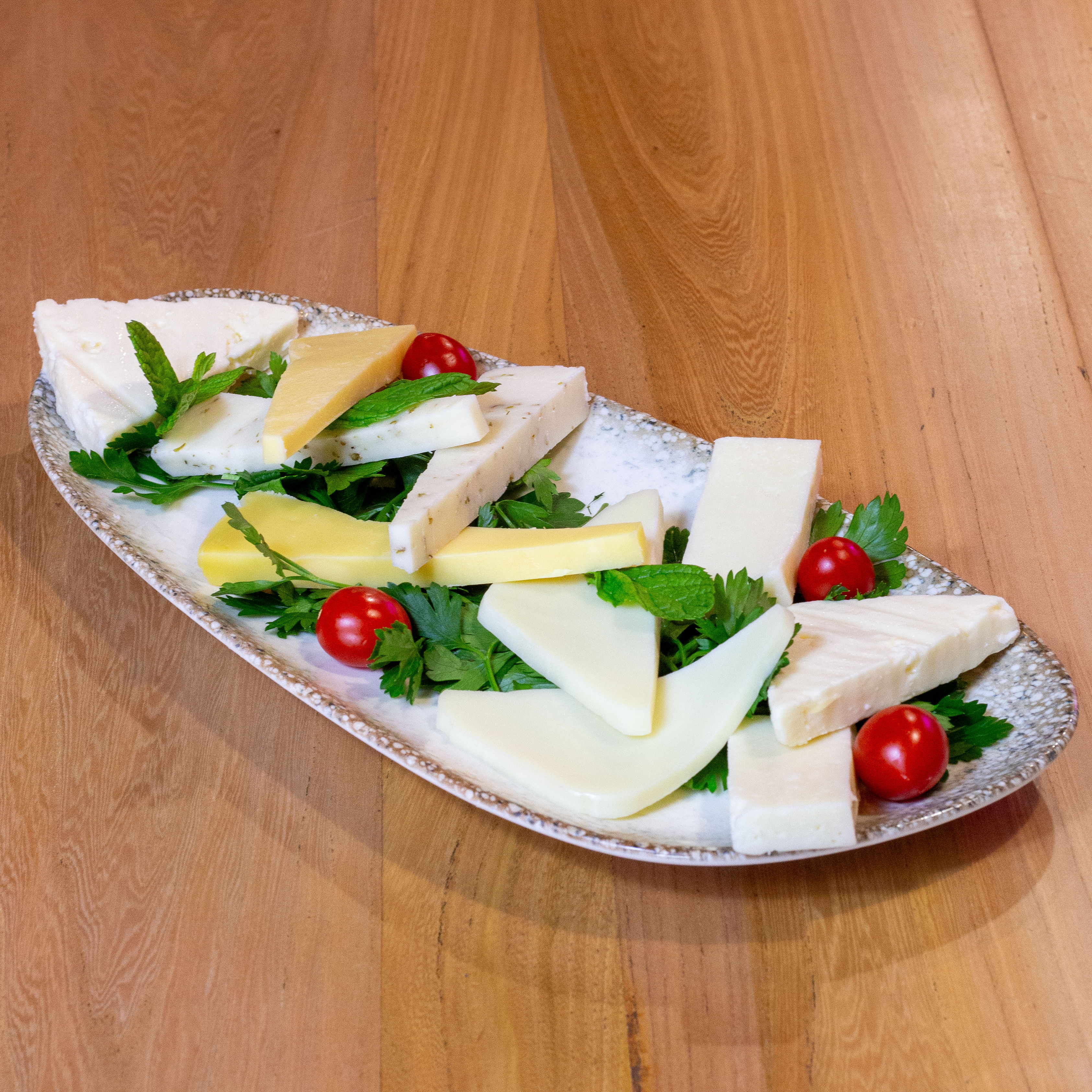 Domates, salatalık, beyaz peynir ve mevsim yeşillikleri ile servis edilir.